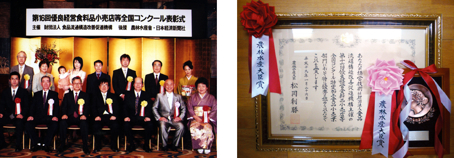 その取り組みが認められ、総合的に優秀な経営技術、および経営成績を持つ小売店として「第16回 優良経営食料品小売店等全国コンクール」最高の賞である「農林水産大臣賞」を受賞。現在は米だけでなく、急速冷凍した安全な玄米だんごを販売する米屋としても、全国のお客様にご利用いただいております。