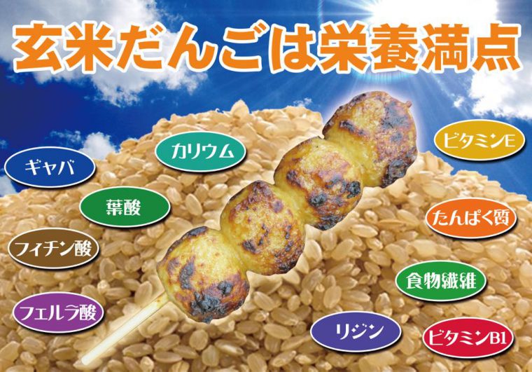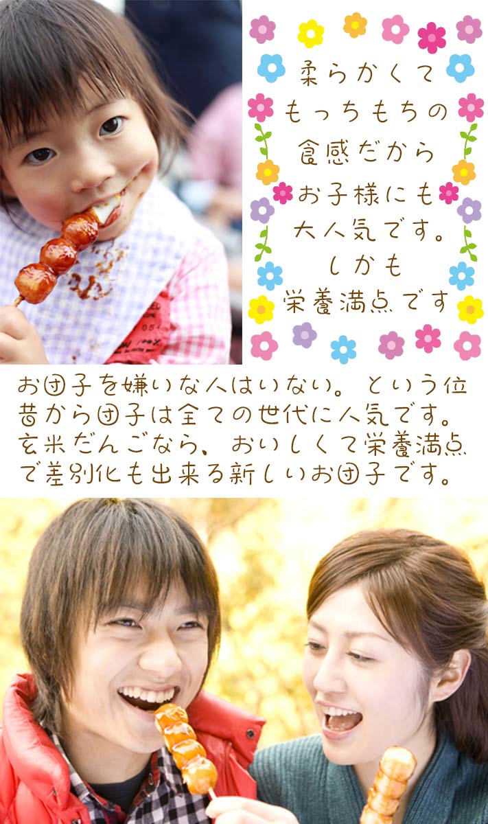白米を100とした玄米の栄養素を比較すると一目瞭然。白米に比べて玄米の栄養素がいかに優れているかが分かります。この栄養素の高さから玄米は『完全栄養食』とも呼ばれています。玄米だんごの米本来の素朴な甘さともちもちした食感は昔ながらのきちんと炊いたお米の味そのものです。消化吸収の良さは、お子様やお年寄りにも最適です。おいしく手軽に食べるうちに食生活が改善し心身共に健康になる。そんな願いを込めたお団子です。