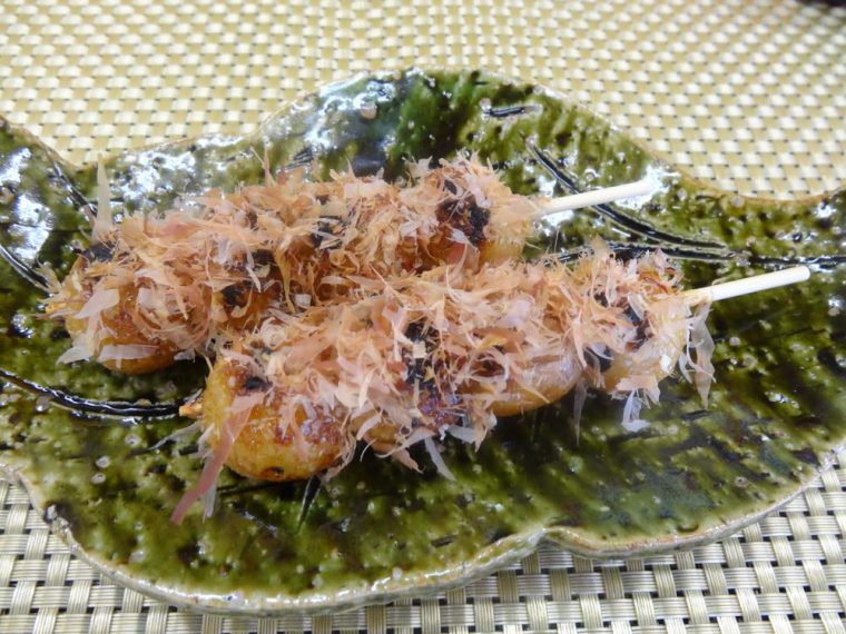 かつお節団子焼醤油だんごにかつお節をトッピング。