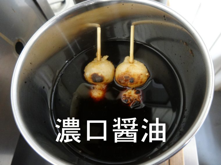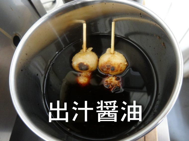 ⑥仕上げに出汁醤油に焼いただんごをつけます。
